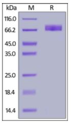 Molecular Mass : | The protein has a calculated MW of 53.0 kDa. The protein migrates as 60-80 kDa under reducing (R) condition (SDS-PAGE) due to glycosylation. |