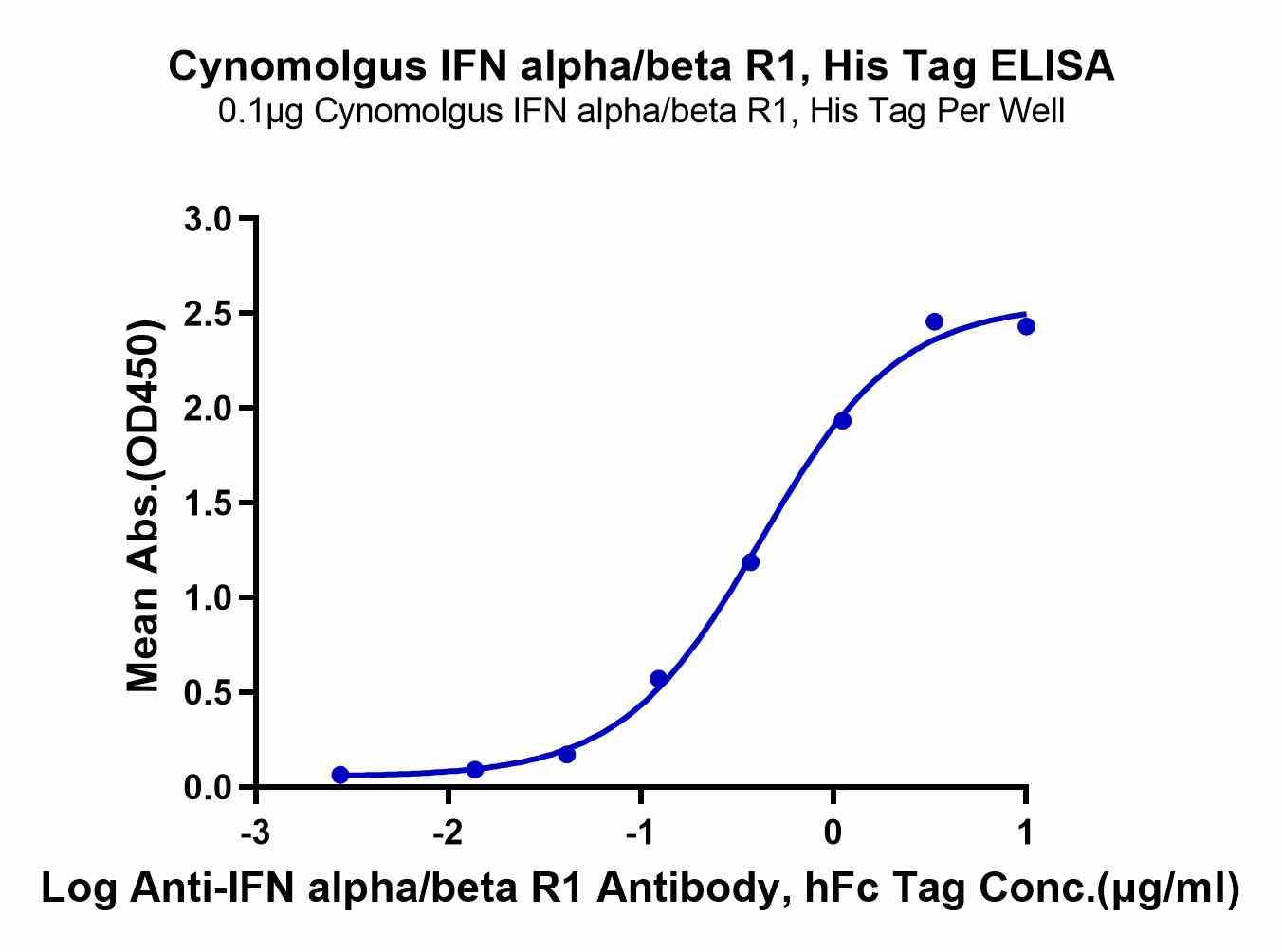 | Bio-activity : | Immobilized Cynomolgus IFN alpha/beta R1, His Tag at 1μg/ml (100μl/well) on the plate. Dose response curve for Anti-IFNAR1 Antibody, hFc Tag with the EC50 of 0.42μg/ml determined by ELISA. |