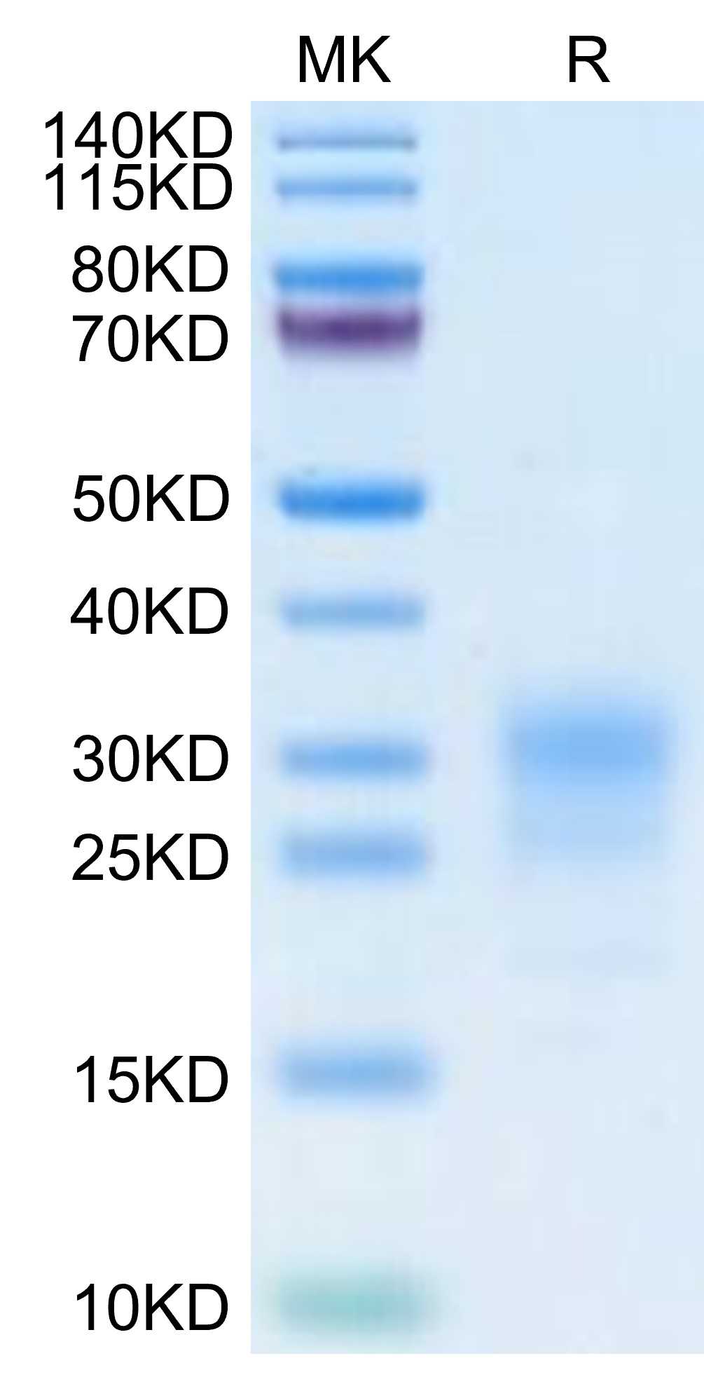 Molecular Mass : | The protein has a predicted MW of 17.72 kDa. Due to glycosylation, the protein migrates to 25-35 kDa based on Tris-Bis PAGE result. |