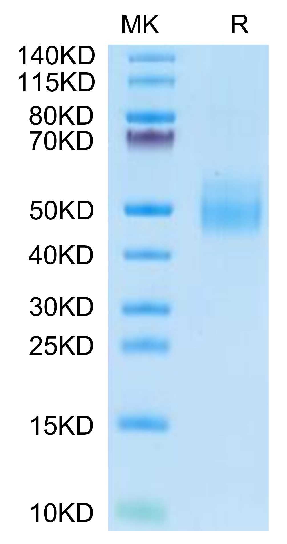 | Molecular Mass : | The protein has a predicted MW of 25.34 kDa. Due to glycosylation, the protein migrates to 45-60 kDa based on Tris-Bis PAGE result. |
