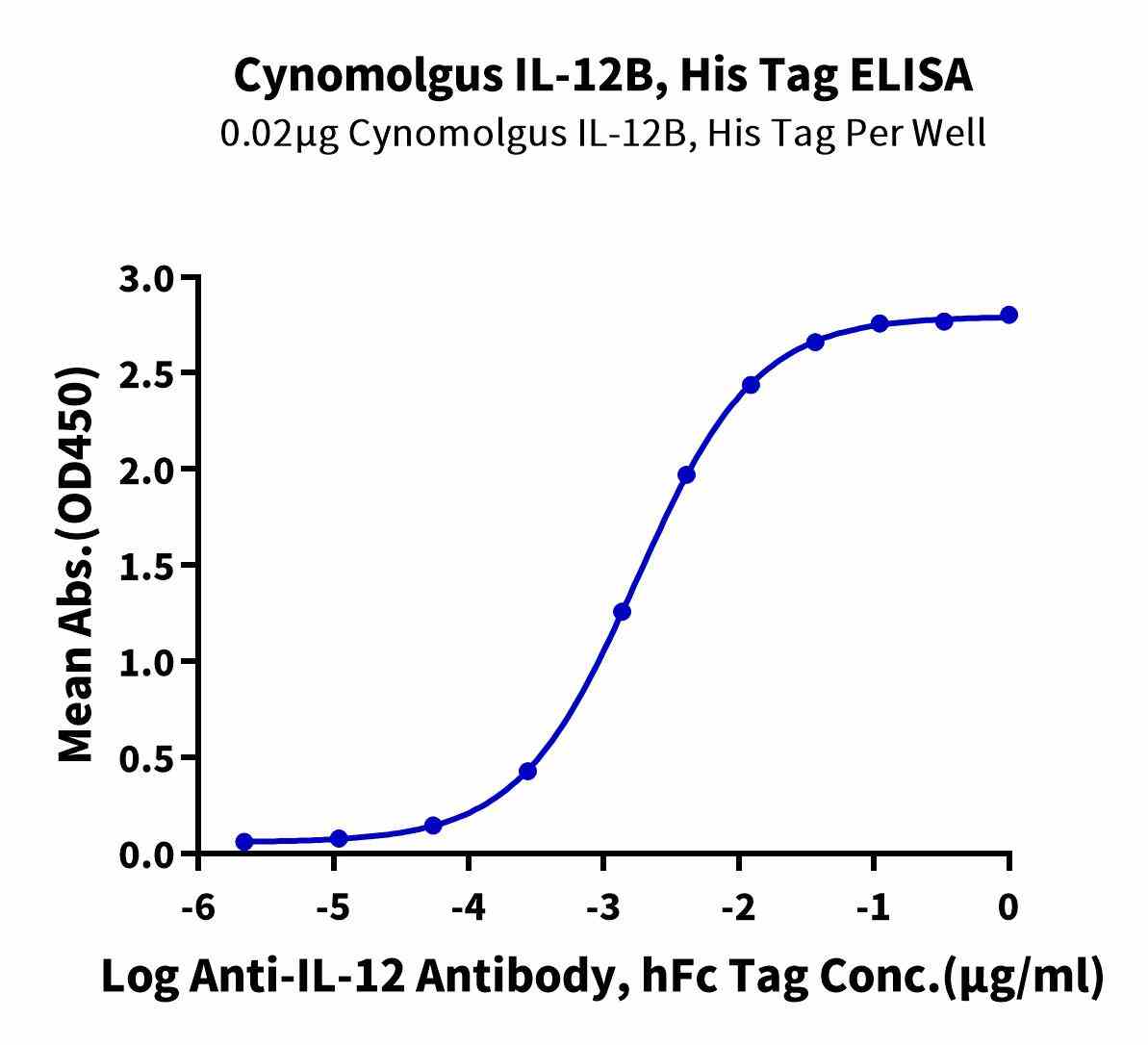| Bio-activity : | Immobilized Cynomolgus IL-12B, His Tag at 0.2μg/ml (100μl/well) on the plate. Dose response curve for Anti-IL-12 Antibody, hFc Tag with the EC50 of 1.8ng/ml determined by ELISA. |