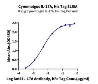 Immobilized Cynomolgus IL-17A, His Tag at 2μg/ml (100μl/well) on the plate. Dose response curve for Anti-IL-17A Antibody, hFc Tag with the EC50 of 4.4ng/ml determined by ELISA. |