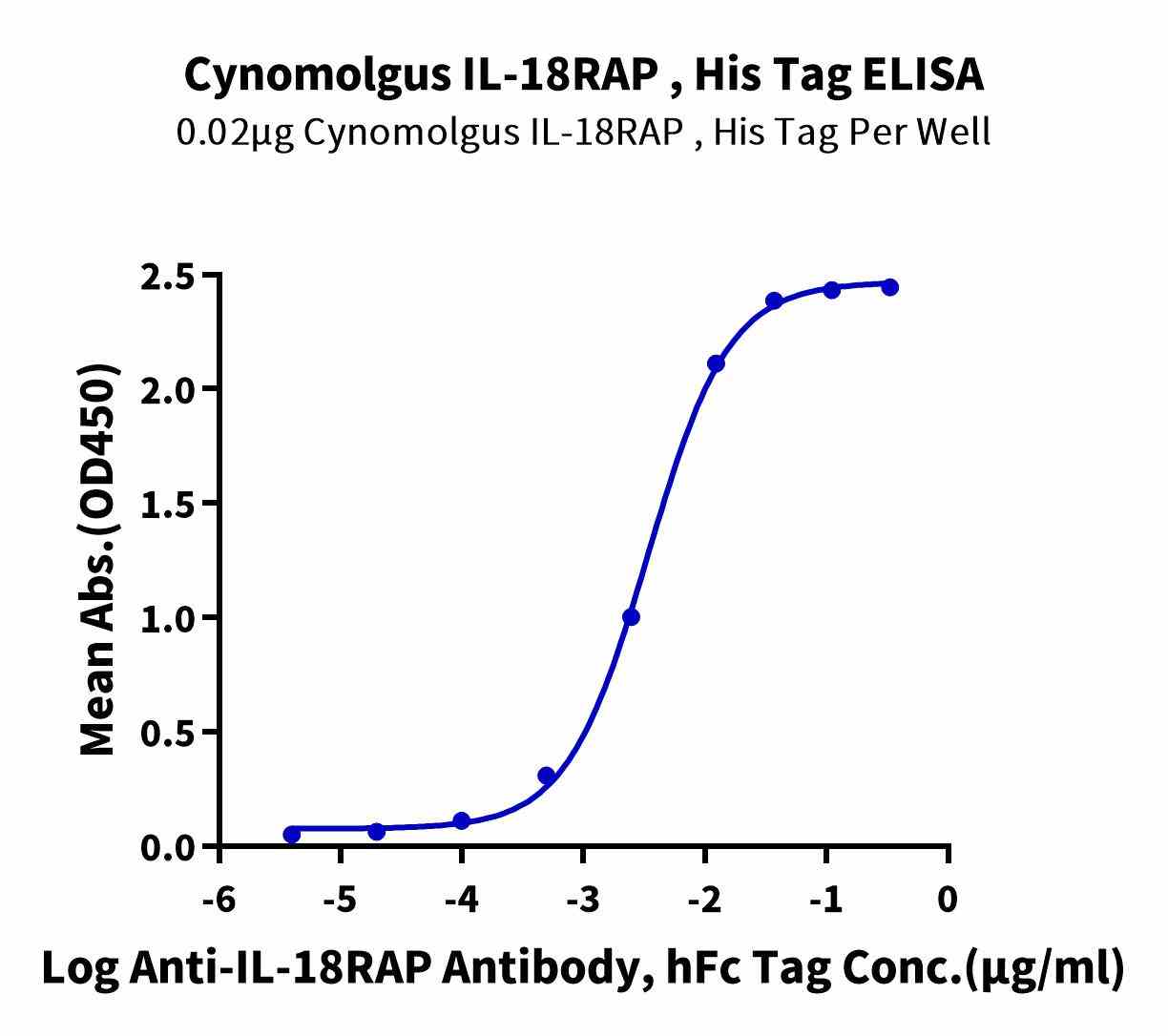 | Bio-activity : | Immobilized Cynomolgus IL-18RAP, His Tag at 0.2μg/ml (100μl/well) on the plate. Dose response curve for Anti-IL-18RAP Antibody, hFc Tag with the EC50 of 3.5ng/ml determined by ELISA. |