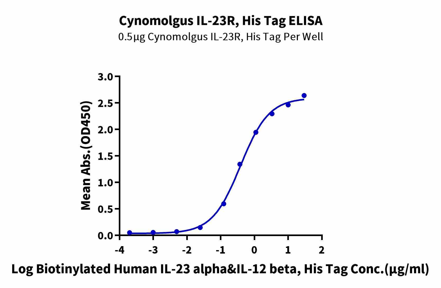 | Bio-activity : | Immobilized Cynomolgus IL-23R, His Tag at 5μg/ml (100μl/well) on the plate. Dose response curve for Biotinylated Human IL-23 alpha&IL-12 beta, His Tag with the EC50 of 0.39μg/ml determined by ELISA. |