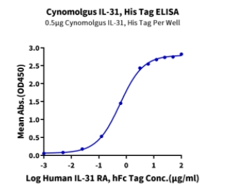 Immobilized Cynomolgus IL-31, His Tag at 5 ug/ml (100 ul/well) on the plate. Dose response curve for Human IL-31 RA, hFc Tag with the EC50 of 0.59 ug/ml determined by ELISA (QC Test). |