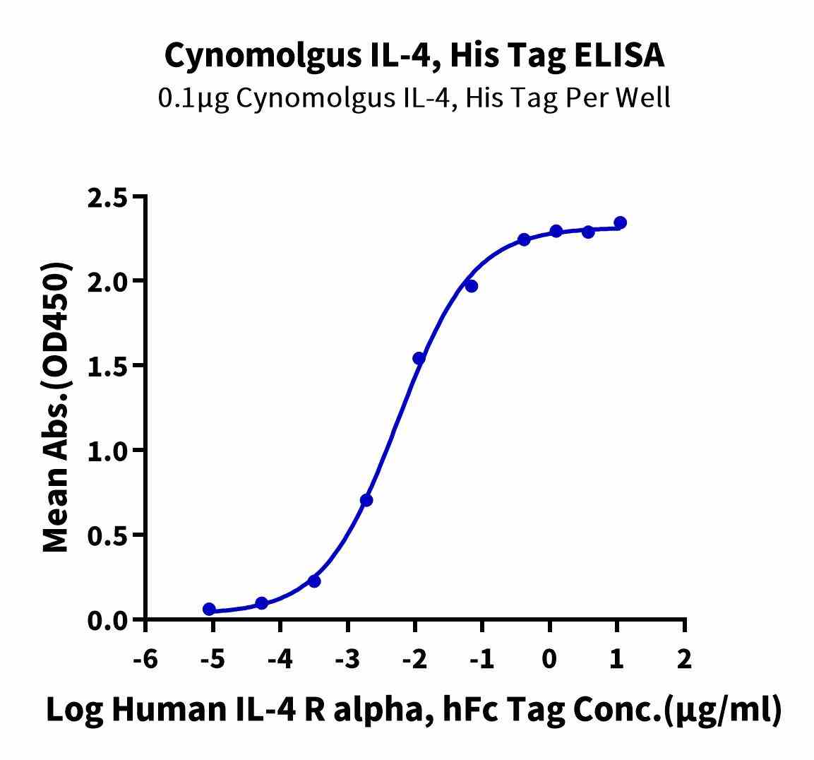 Immobilized Cynomolgus IL-4, His Tag at 1μg/ml (100μl/well) on the plate. Dose response curve for Human IL-4 R alpha, hFc Tag with the EC50 of 5.5ng/ml determined by ELISA. |