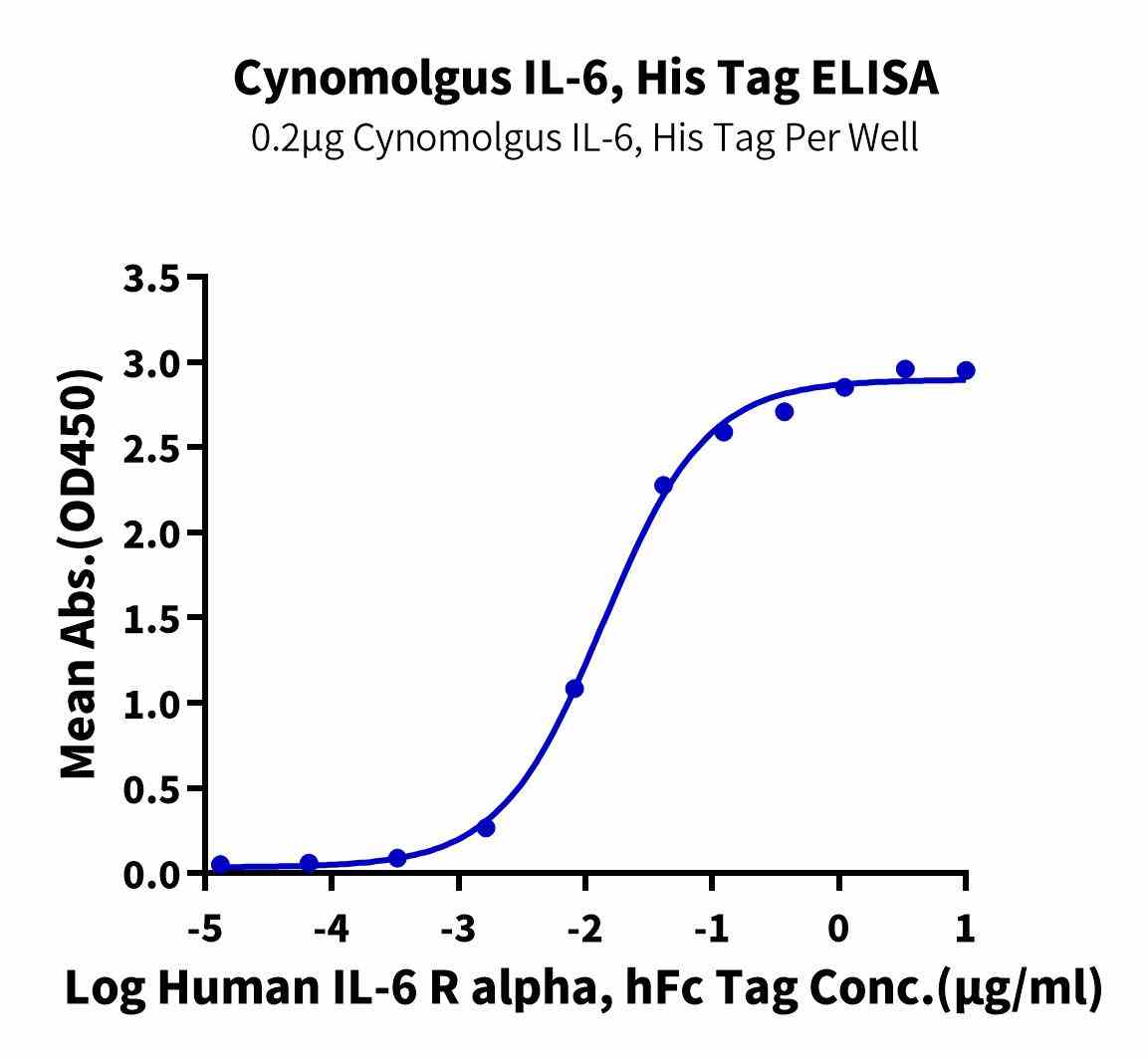 Immobilized Cynomolgus IL-6, His Tag at 2μg/ml (100μl/well) on the plate. Dose response curve for Human IL-6 R alpha, hFc Tag with the EC50 of 13.8ng/ml determined by ELISA. |