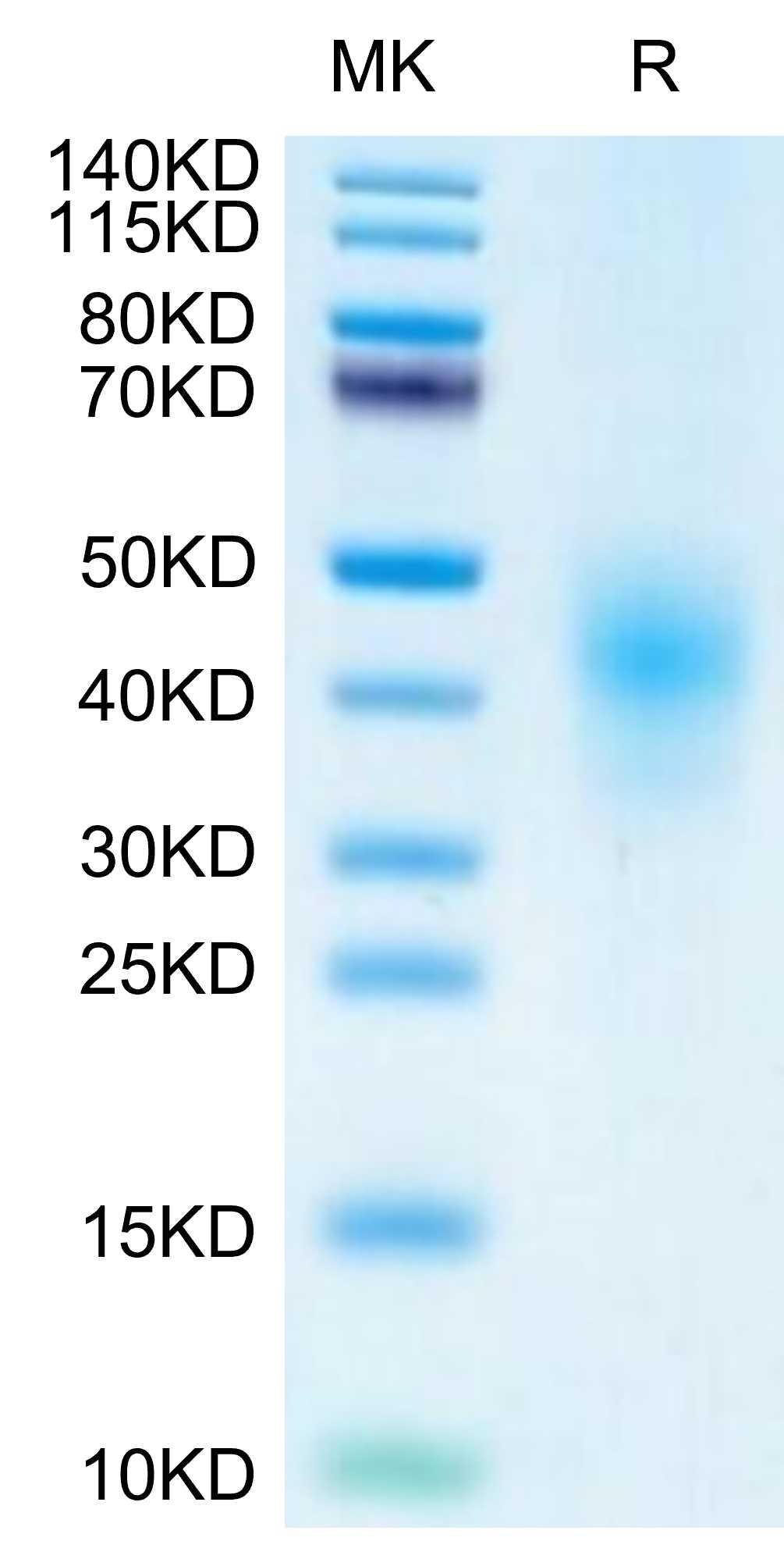 | Molecular Mass : | The protein has a predicted MW of 17.48 kDa. Due to glycosylation, the protein migrates to 40-50 kDa based on Tris-Bis PAGE result. |