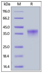 Molecular Mass : | The protein has a calculated MW of 28.0 kDa. The protein migrates as 34-42 kDa under reducing (R) condition (SDS-PAGE) due to glycosylation. |