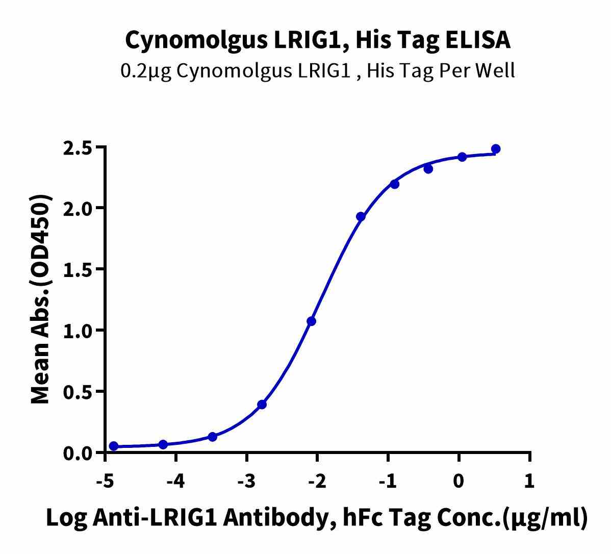 Immobilized Cynomolgus LRIG1, His Tag at 2μg/ml (100μl/well) on the plate. Dose response curve for Anti-LRIG1 Antibody, hFc Tag with the EC50 of 11.6ng/ml determined by ELISA. |
