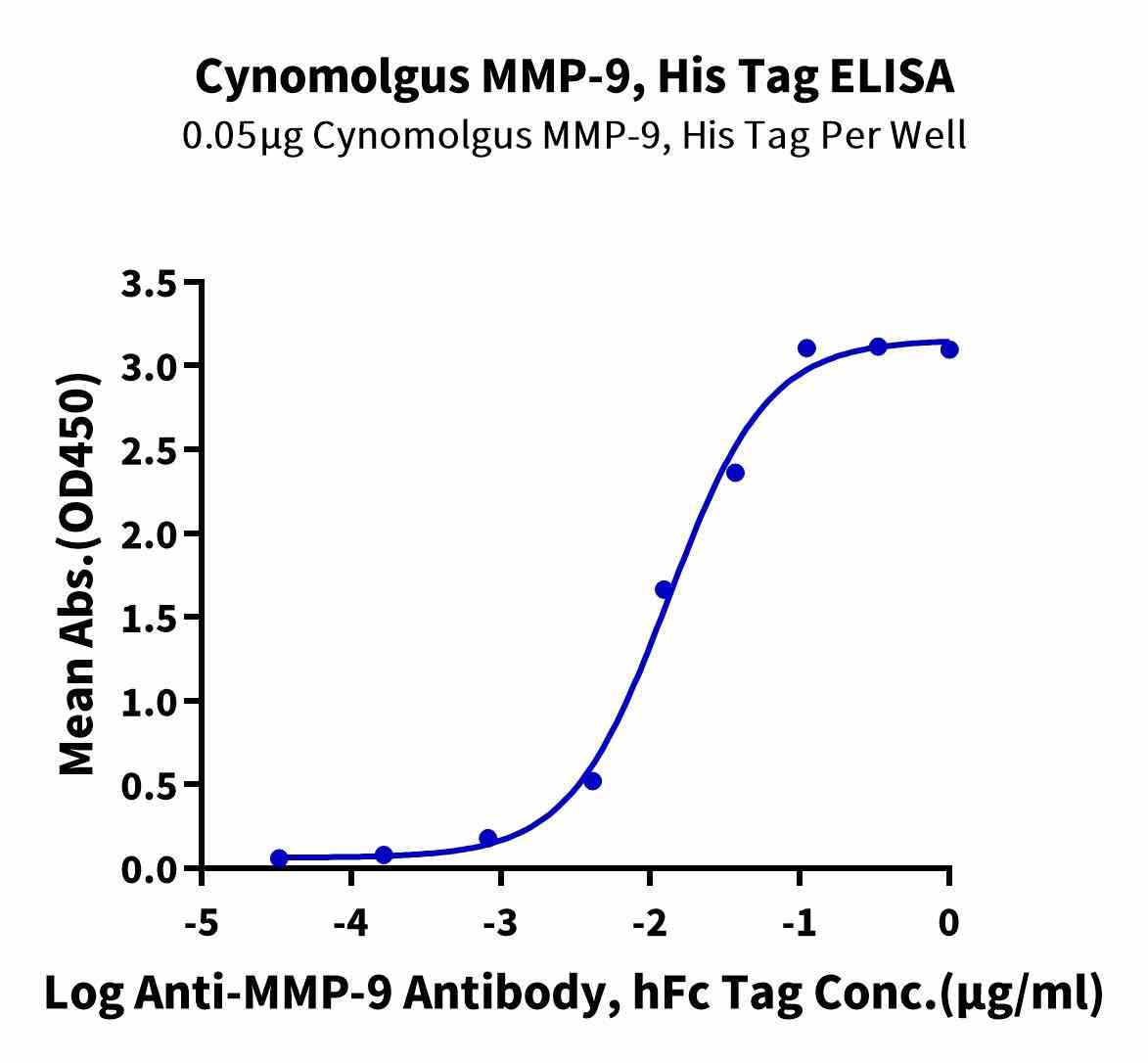 | Bio-activity : | Immobilized Cynomolgus MMP-9, His Tag at 0.5μg/ml (100μl/Well) on the plate. Dose response curve for Anti-MMP-9 Antibody, hFc Tag with the EC50 of 13.2ng/ml determined by ELISA. |