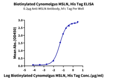 | Bio-activity : | Immobilized Anti-MSLN Antibody, hFc Tag at 2μg/ml (100μl/Well) on the plate. Dose response curve for Biotinylated Cynomolgus MSLN, His Tag with the EC50 of 44.0ng/ml determined by ELISA. |