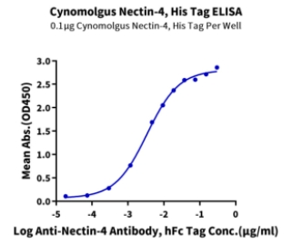 | Bio-activity : | Immobilized Cynomolgus Nectin-4, His Tag at 1ug/ml (100ul/Well) on the plate. Dose response curve for Anti-Nectin-4 Antibody, hFc Tag with the EC50 of 3.4ng/ml determined by ELISA. |