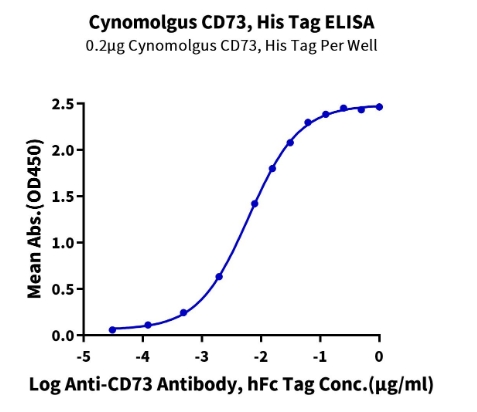 | Bio-activity : | Immobilized Cynomolgus CD73, His Tag at 2μg/ml (100μl/Well) on the plate. Dose response curve for Anti-CD73 Antibody, hFc Tag with the EC50 of 6.2ng/ml determined by ELISA. |