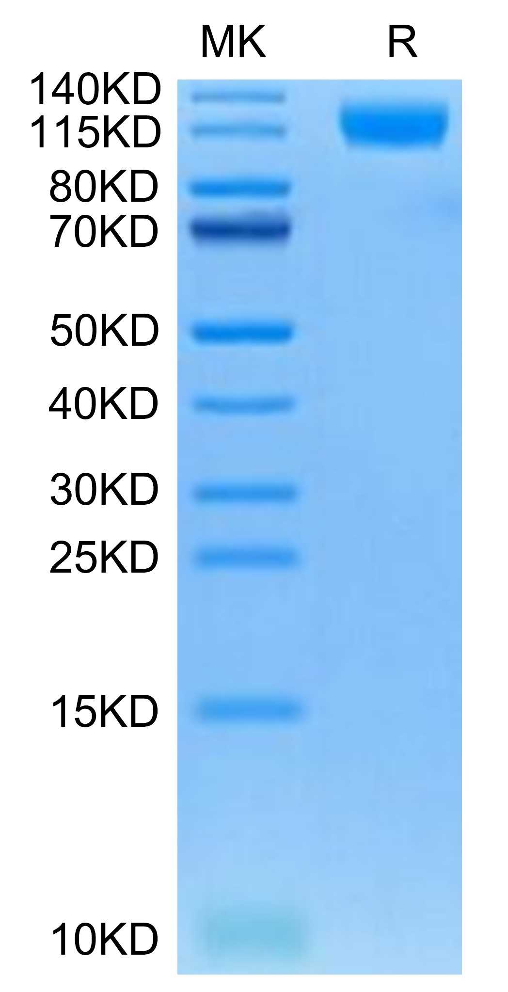 The protein has a predicted MW of 82.04 kDa. Due to glycosylation, the protein migrates to 110-130 kDa based on Tris-Bis PAGE result. |