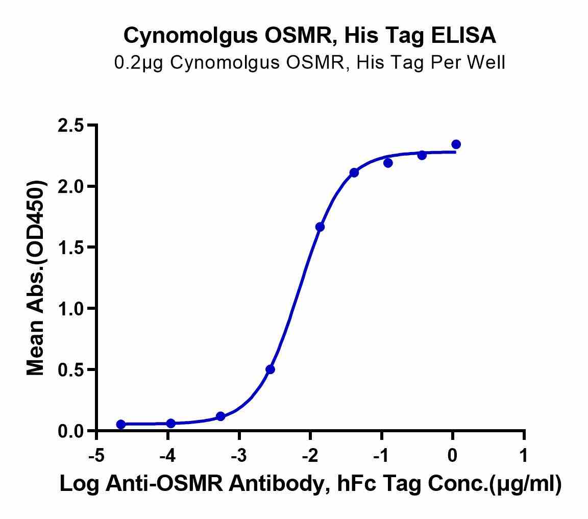 Immobilized Cynomolgus OSMR, His Tag at 2μg/ml (100μl/well) on the plate. Dose response curve for Anti-OSMR Antibody, hFc Tag with the EC50 of 7.1ng/ml determined by ELISA. |