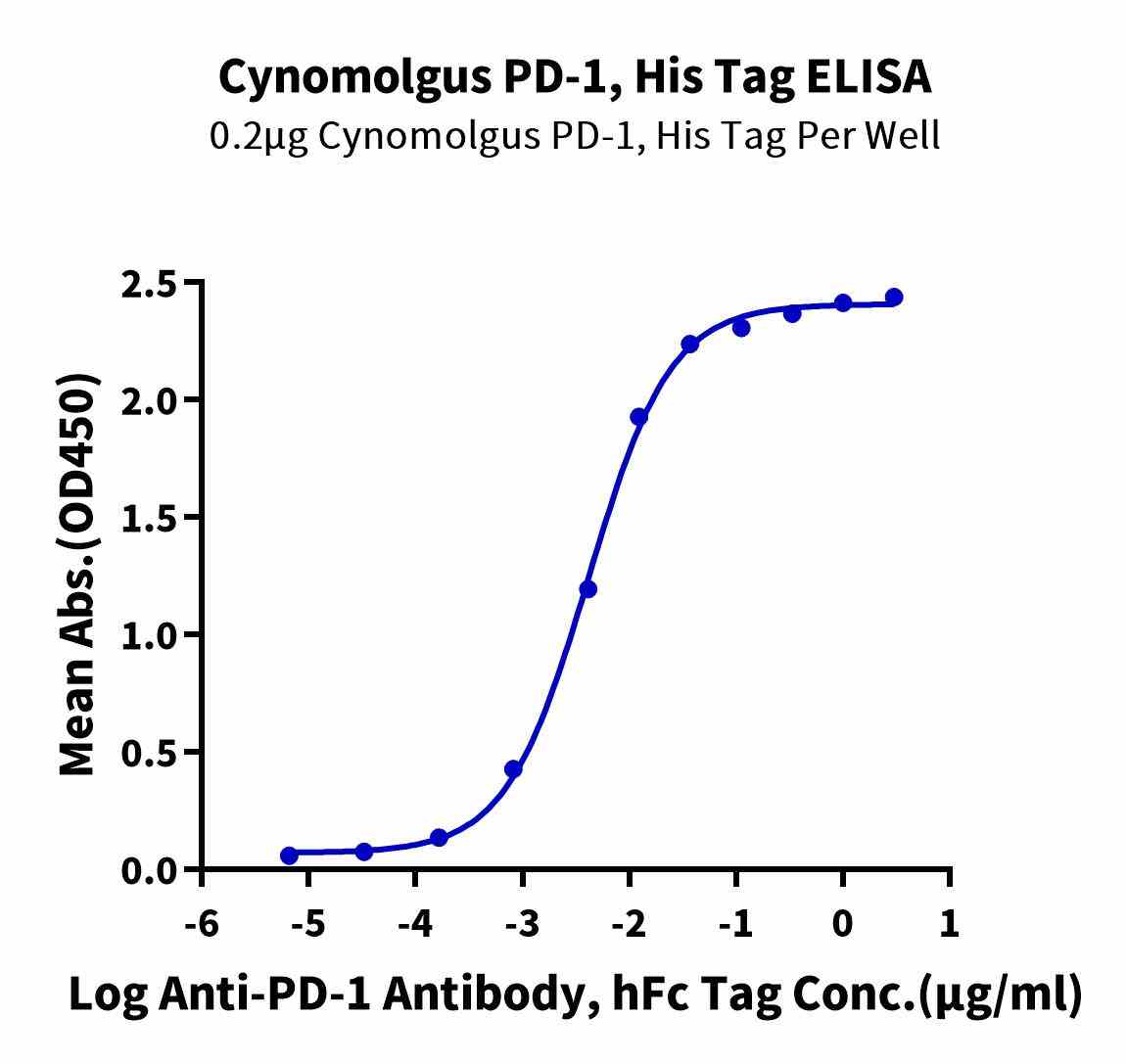 | Bio-activity : | Immobilized Cynomolgus PD-1, His Tag at 2μg/ml (100μl/well) on the plate. Dose response curve for Anti-PD-1 Antibody, hFc Tag with the EC50 of 4.1ng/ml determined by ELISA. |