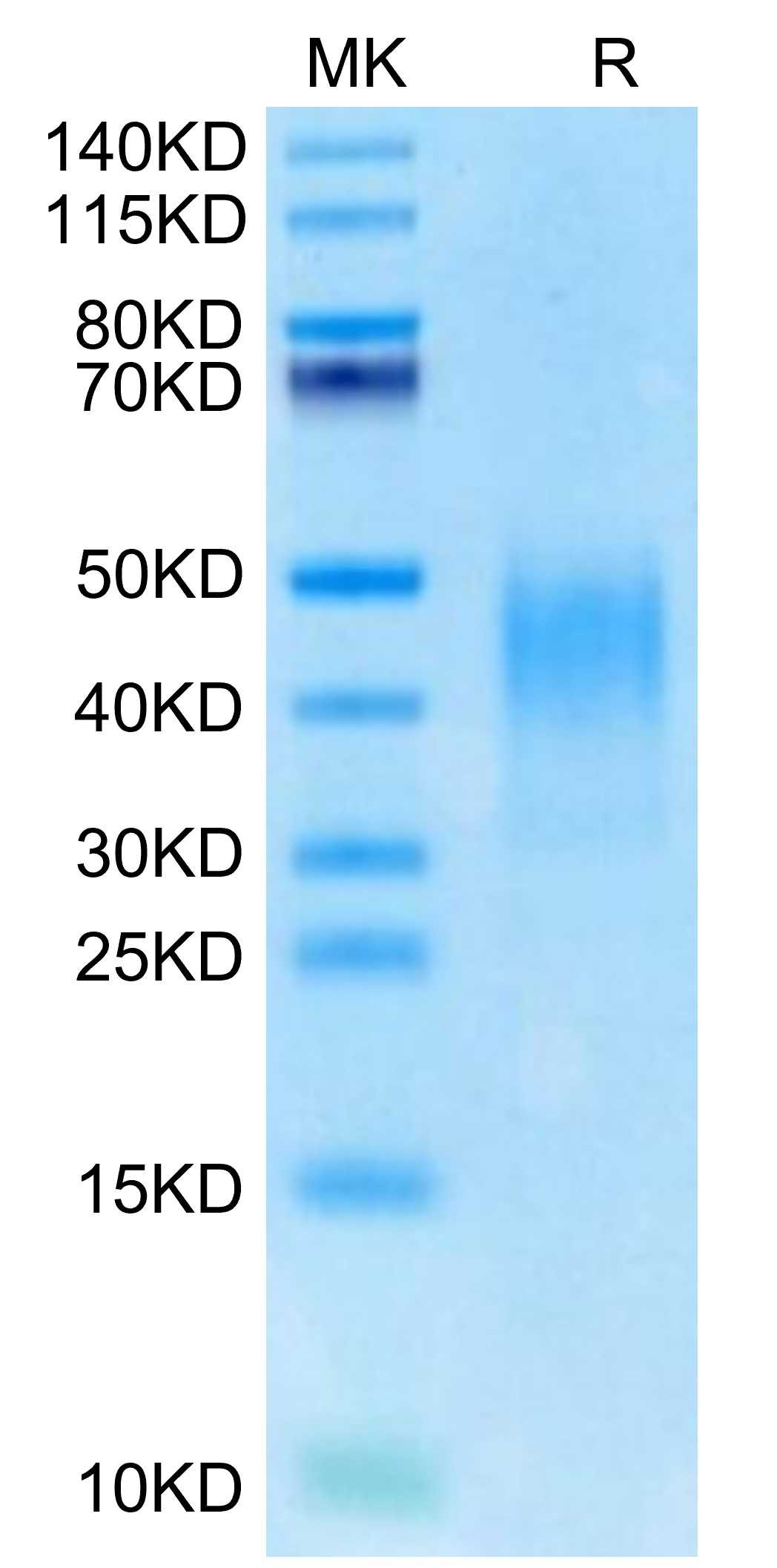 | Molecular Mass : | The protein has a predicted MW of 23.73 kDa. Due to glycosylation, the protein migrates to 40-50 kDa based on Tris-Bis PAGE result. |