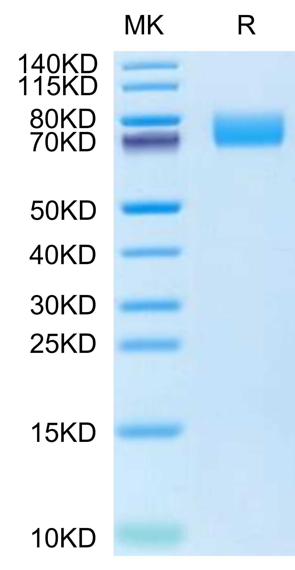Molecular Mass : | The protein has a predicted MW of 57.32 kDa. Due to glycosylation, the protein migrates to 70-85 kDa based on Tris-Bis PAGE result. |