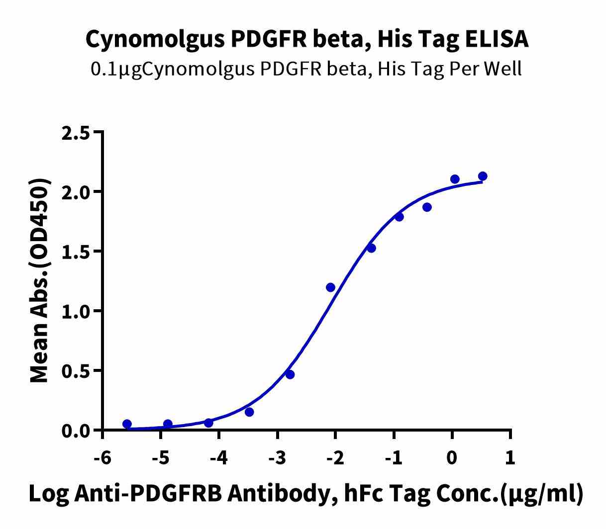 | Bio-activity : | Immobilized Cynomolgus PDGFR beta, His Tag at 1μg/ml (100μl/well) on the plate. Dose response curve for Anti-PDGFRB Antibody, hFc Tag with the EC50 of 8.3ng/ml determined by ELISA. |