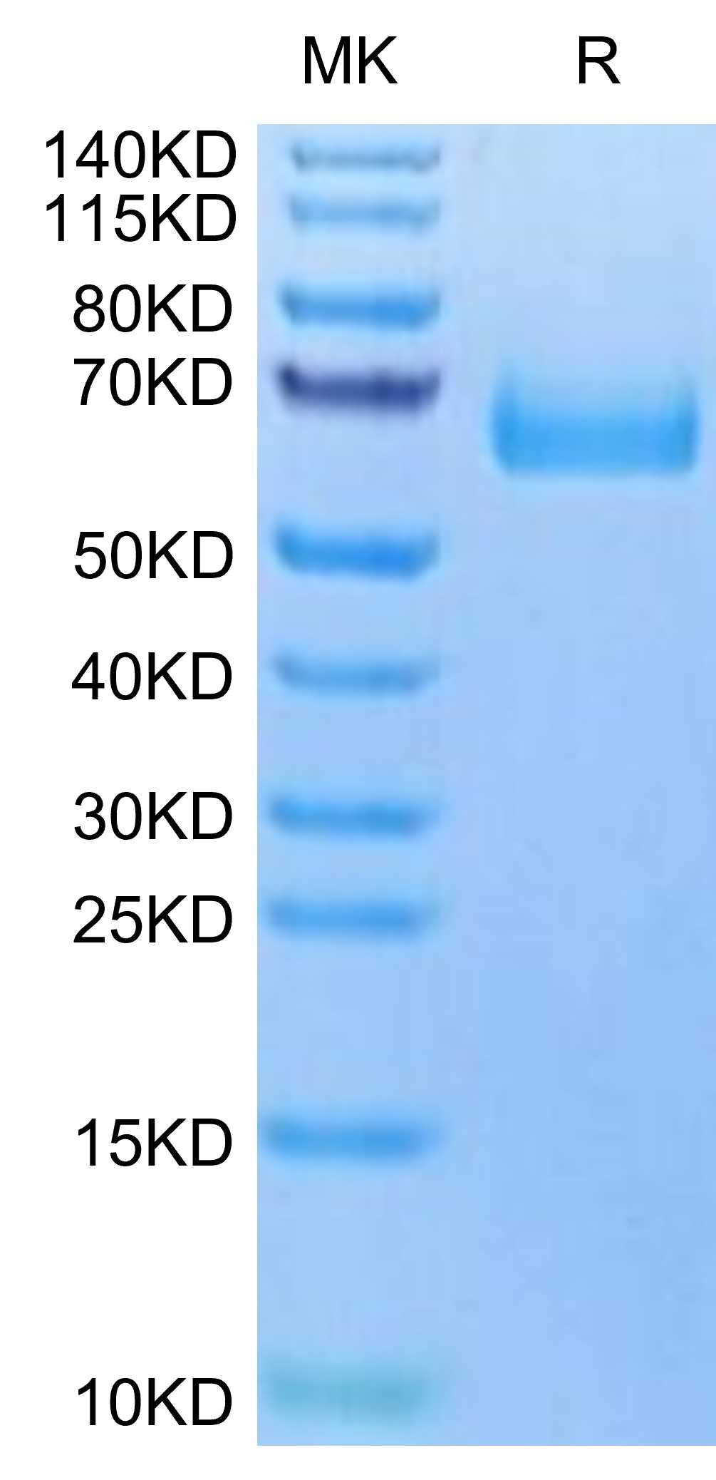 Molecular Mass : | The protein has a predicted MW of 32.69 kDa. Due to glycosylation, the protein migrates to 60-70 kDa based on Tris-Bis PAGE result. |