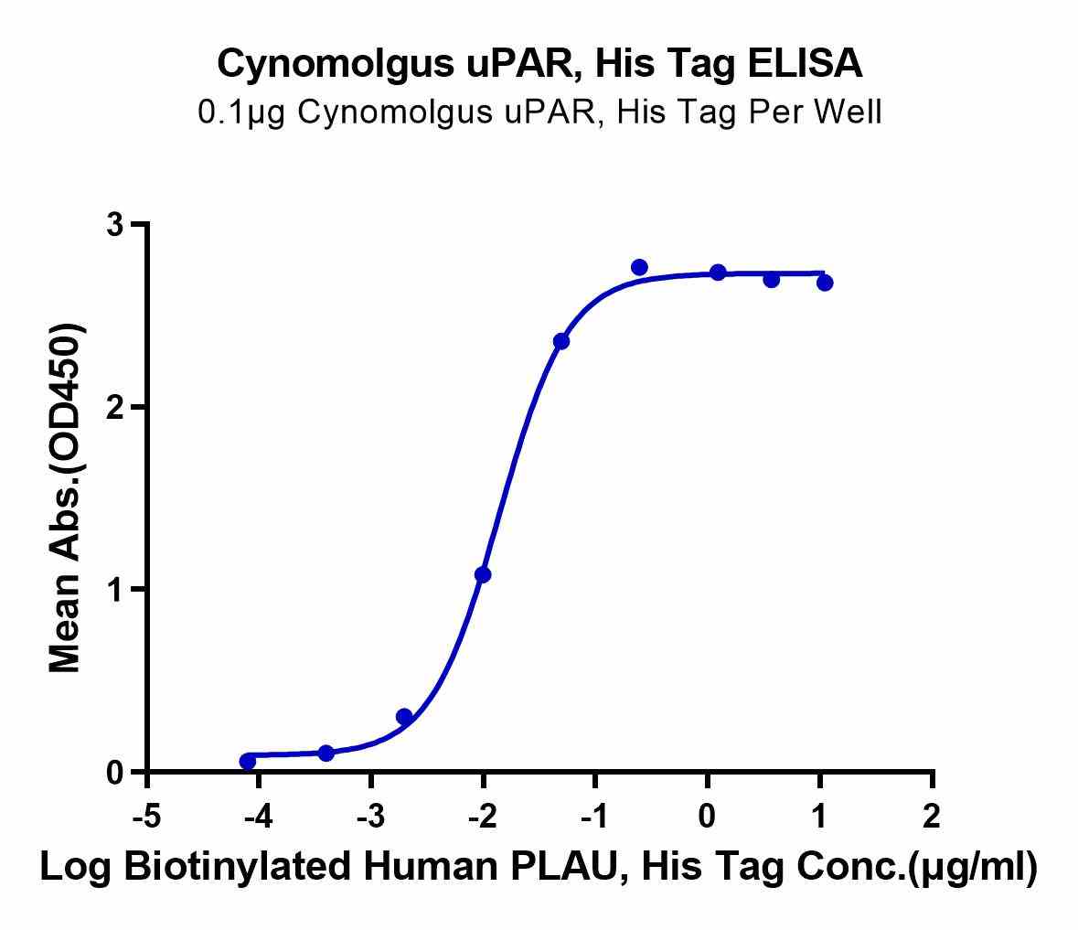 Immobilized Cynomolgus uPAR, His Tag at 1μg/ml (100μl/well) on the plate. Dose response curve for Biotinylated Human PLAU, His Tag with the EC50 of 13.8ng/ml determined by ELISA. |