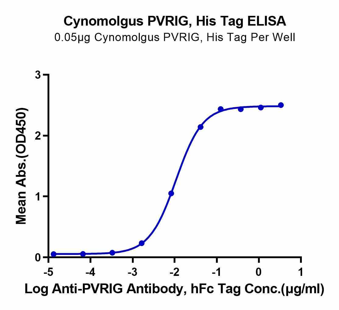 | Bio-activity : | Immobilized Cynomolgus PVRIG, His Tag at 0.5μg/ml (100μl/well) on the plate. Dose response curve for Anti-PVRIG Antibody, hFc Tag with the EC50 of 10.7ng/ml determined by ELISA. |