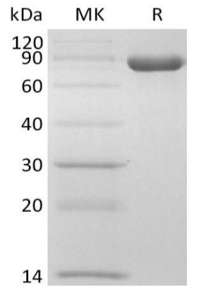 The recombinant Cynomolgus PVRL4 Protein has a predicted molecular mass of 61kDa, it migrates with an apparent molecular mass of 80-90kDa under reducing conditions. |
