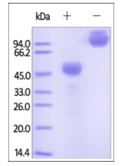 | Molecular Mass : | The protein has a calculated MW of 40.0 kDa. As a result of glycosylation, the protein migrates as 45-52 kDa under reducing (R) condition, and 90-105 kDa under non-reducing (NR) condition (SDS-PAGE). |