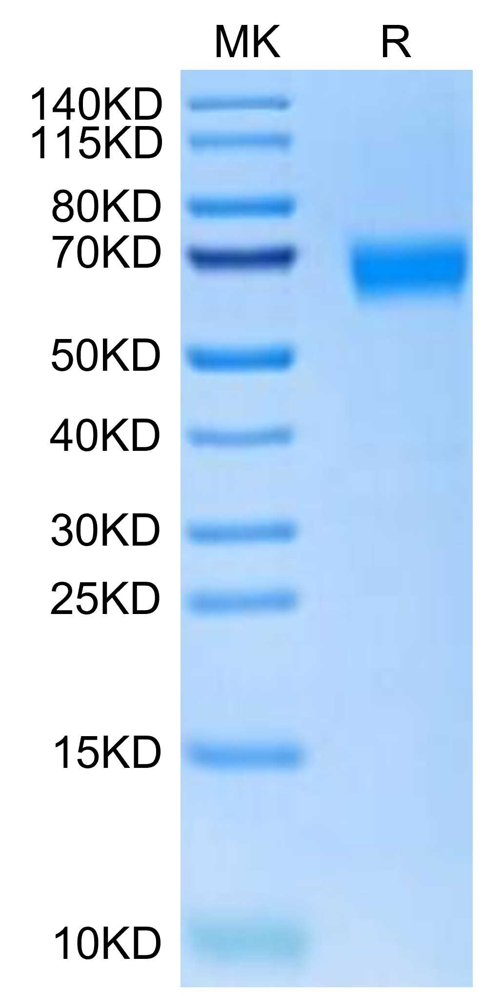 The protein has a predicted MW of 46.34 kDa. Due to glycosylation, the protein migrates to 60-73 kDa based on Tris-Bis PAGE result. |