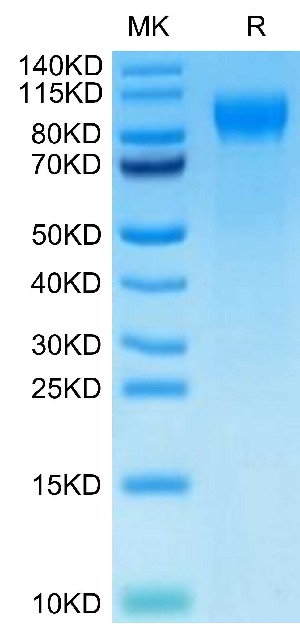| Molecular Mass : | The protein has a predicted MW of 59.47 kDa. Due to glycosylation, the protein migrates to 80-110 kDa based on Tris-Bis PAGE result. |