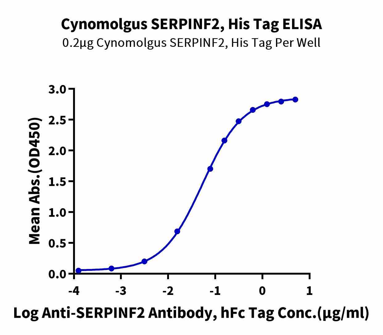 | Bio-activity : | Immobilized Cynomolgus SERPINF2, His Tag at 2μg/ml (100μl/Well) on the plate. Dose response curve for Anti-SERPINF2 Antibody, hFc Tag with the EC50 of 53.5ng/ml determined by ELISA. |