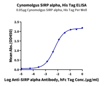 | Bio-activity : | Immobilized Cynomolgus SIRP alpha, His Tag at 0.5μg/ml (100μl/Well) on the plate. Dose response curve for Anti-SIRP alpha Antibody, hFc Tag with the EC50 of 5.4ng/ml determined by ELISA. |