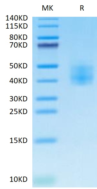 | Molecular Mass : | The protein has a predicted MW of 23.98 kDa. Due to glycosylation, the protein migrates to 37-50 kDa based on Tris-Bis PAGE result. |