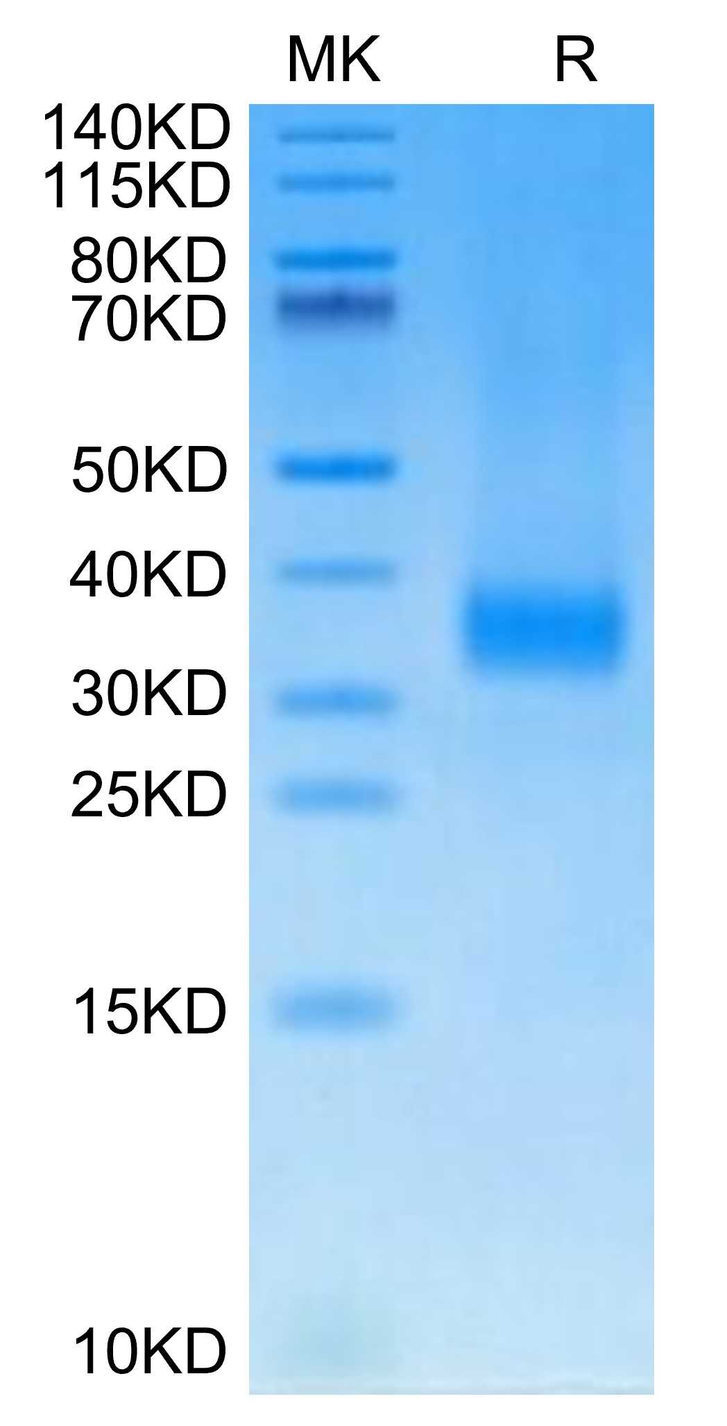 | Molecular Mass : | The protein has a predicted MW of 22.58 kDa. Due to glycosylation, the protein migrates to 30-40 kDa based on Tris-Bis PAGE result. |
