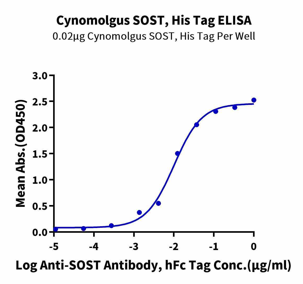 | Bio-activity : | Immobilized Cynomolgus SOST, His Tag at 0.2μg/ml (100μl/Well) on the plate. Dose response curve for Anti-SOST Antibody, hFc Tag with the EC50 of 10.0ng/ml determined by ELISA. |