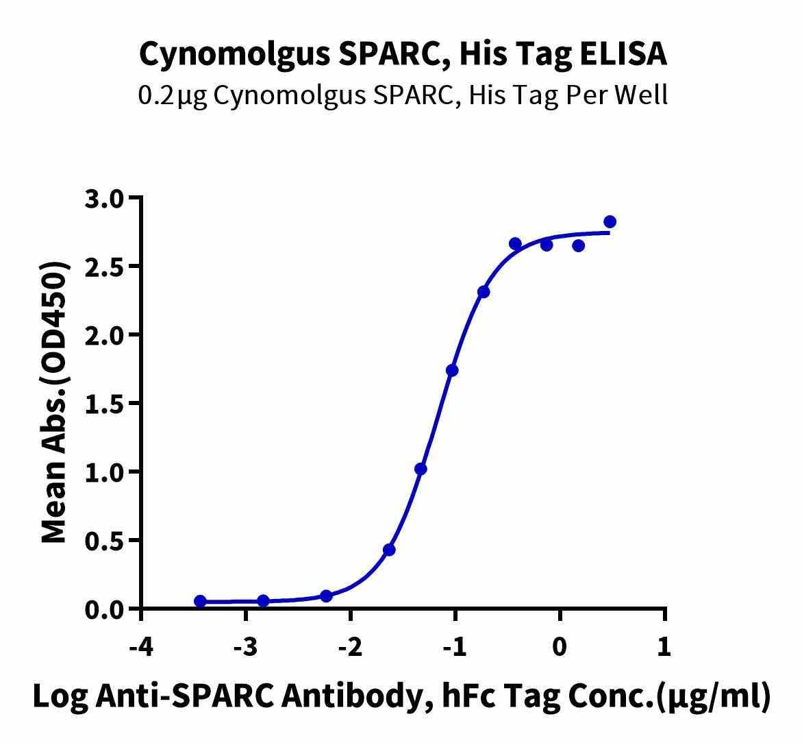 | Bio-activity : | Immobilized Cynomolgus SPARC, His Tag at 2μg/ml (100μl/well) on the plate. Dose response curve for Anti-SPARC Antibody, hFc Tag with the EC50 of 67.8ng/ml determined by ELISA. |