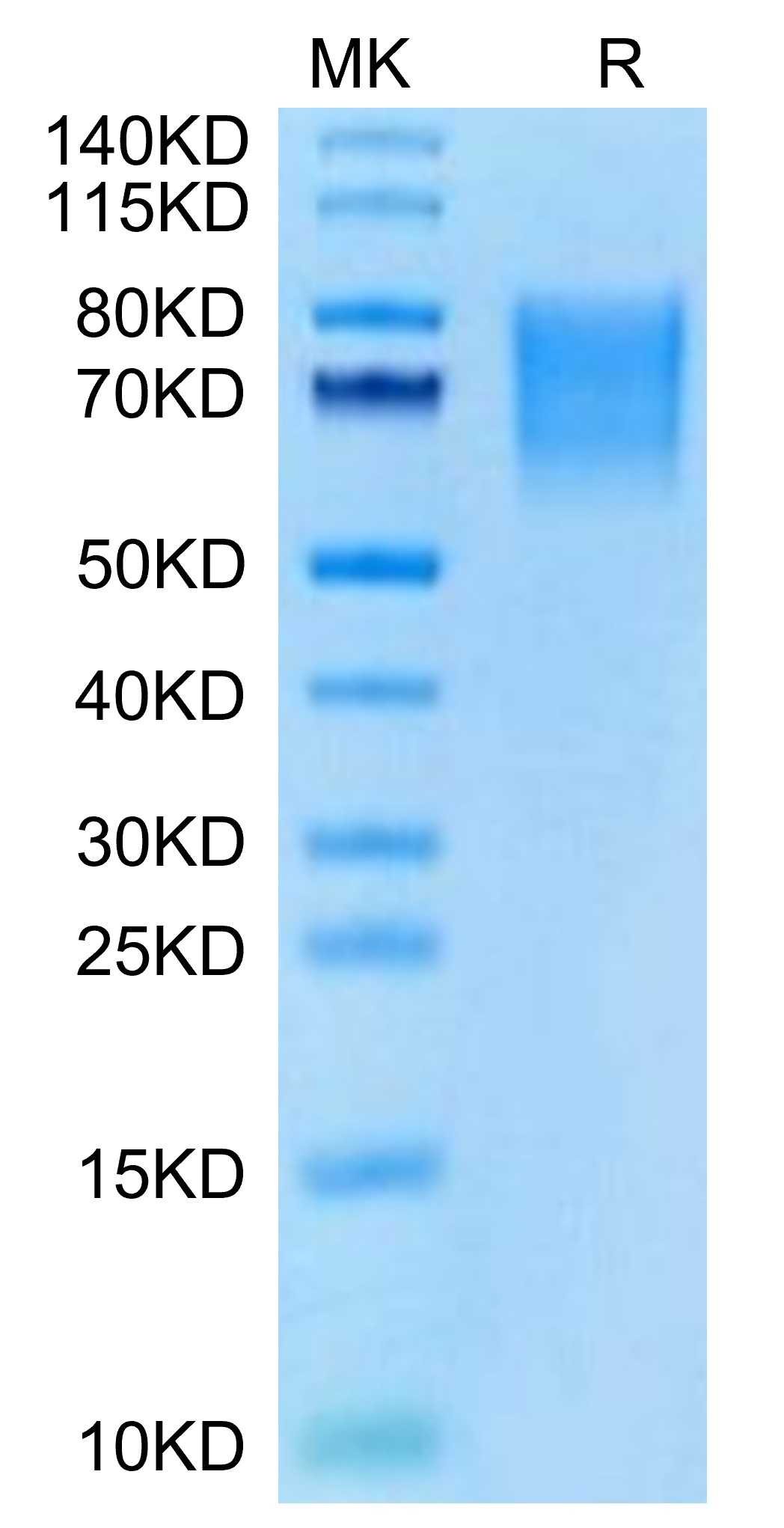 | Molecular Mass : | The protein has a predicted MW of 34.63 kDa. Due to glycosylation, the protein migrates to 60-80 kDa based on Tris-Bis PAGE result. |