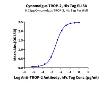 | Bio-activity : | Immobilized Cynomolgus TROP-2, His Tag at 0.5ug/ml (100ul/well) on the plate. Dose response curve for Anti-TROP-2 Antibody, hFc Tag with the EC50 of 2.8ng/ml determined by ELISA. |