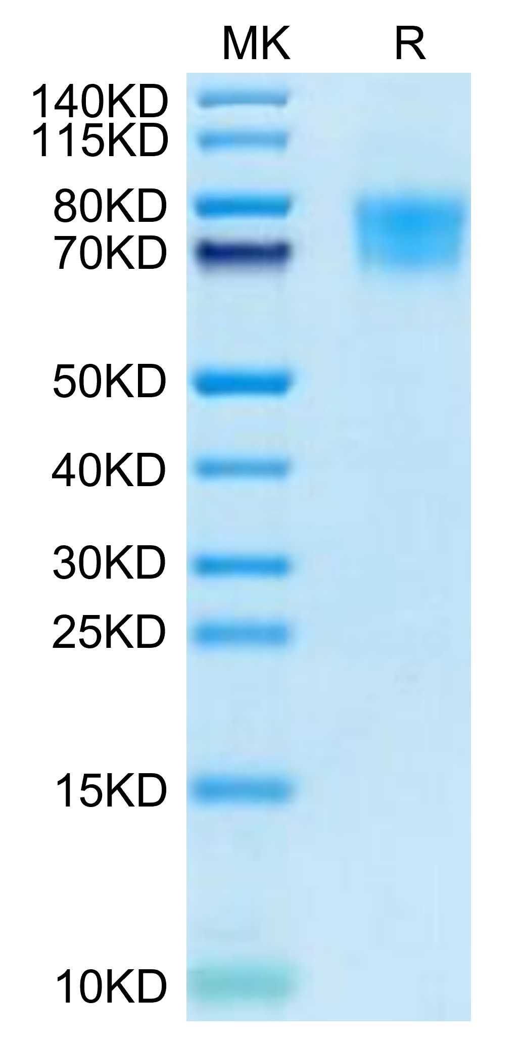 Molecular Mass : | The protein has a predicted MW of 31.55 kDa. Due to glycosylation, the protein migrates to 70-80 kDa based on Tris-Bis PAGE result. |