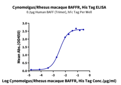| Bio-activity : | Immobilized Human BAFF (Trimer), hFc Tag at 2ug/ml (100ul/well) on the plate. Dose response curve for Cynomolgus/Rhesus macaque BAFFR, His Tag with the EC50 of 3.4ng/ml determined by ELISA. |