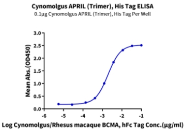 Immobilized Cynomolgus APRIL (Trimer) , His Tag at 1 ug/ml (100 ul/well) on the plate. Dose response curve for Cynomolgus/Rhesus macaque BCMA, hFc Tag with the EC50 of 1.9 ng/ml determined by ELISA. |