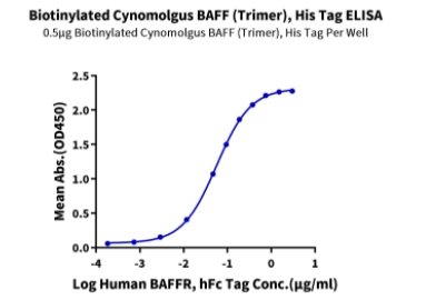 | Bio-activity : | Immobilized Biotinylated Cynomolgus BAFF (Trimer), His Tag at 5ug/ml (100ul/well) on the streptavidin precoated plate (5ug/ml). Dose response curve for Human BAFFR, hFc Tag with the EC50 of 56.2ng/ml determined by ELISA. |