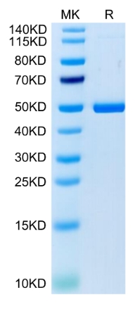 Molecular Mass : | The protein has a predicted MW of 46 kDa. Due to glycosylation, the protein migrates to 50-52 kDa based on Tris-Bis PAGE result. |