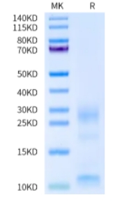 The protein has a predicted MW of 16.3 kDa. Due to glycosylation, the protein migrates to 23-26 kDa based on Tris-Bis PAGE result. |