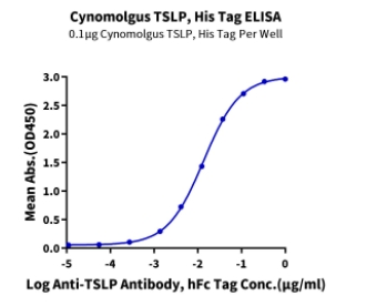 Immobilized Cynomolgus TSLP, His Tag at 1ug/ml (100ul/Well) on the plate. Dose response curve for Anti-TSLP Antibody, hFc Tag with the EC50 of 13.6ng/ml determined by ELISA. |