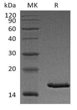 The recombinant Cynomolgus TSLP Protein has a predicted molecular mass of 16.2kDa , it migrates with an apparent molecular mass of 16kDa under reducing conditions. |