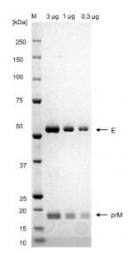 | Product Overview : | Recombinant Dengue Virus serotype 1 virus-like particle recombinant antigen consisting of Envelope, pre-Membrane and Membrane protein produced in 293 human cells. The C-terminal 20% of the dengue Envelope protein was replaced by the corresponding Japanese encephalitis virus SA-14 sequence (Envelope protein amino acids 399-497). The replaced sequence corresponds to the transmembrane and intraparticle portion of the protein. Sequence Strain: Puerto Rico/US/BID-V853/1998 |