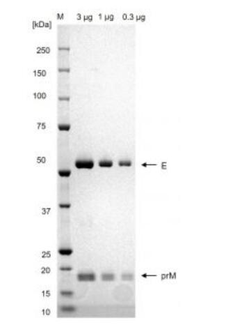 | Product Overview : | Recombinant Dengue Virus serotype 1 virus-like particle recombinant antigen consisting of Envelope, pre-Membrane and Membrane protein produced in 293 human cells. The C-terminal 20% of the dengue Envelope protein was replaced by the corresponding Japanese encephalitis virus SA-14 sequence (Envelope protein amino acids 399-497). The replaced sequence corresponds to the transmembrane and intraparticle portion of the protein. |