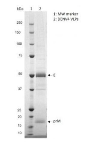 | Product Overview : | Recombinant Dengue Virus serotype 4 virus-like particle recombinant antigen consisting of Envelope, pre-Membrane and Membrane protein produced in 293 human cells. The Cterminal 20% of the dengue Envelope protein was replaced by the corresponding Japanese encephalitis virus SA-14 sequence (Envelope protein amino acids 400-495). The replaced sequence corresponds to the transmembrane and intraparticle portion of the protein. |